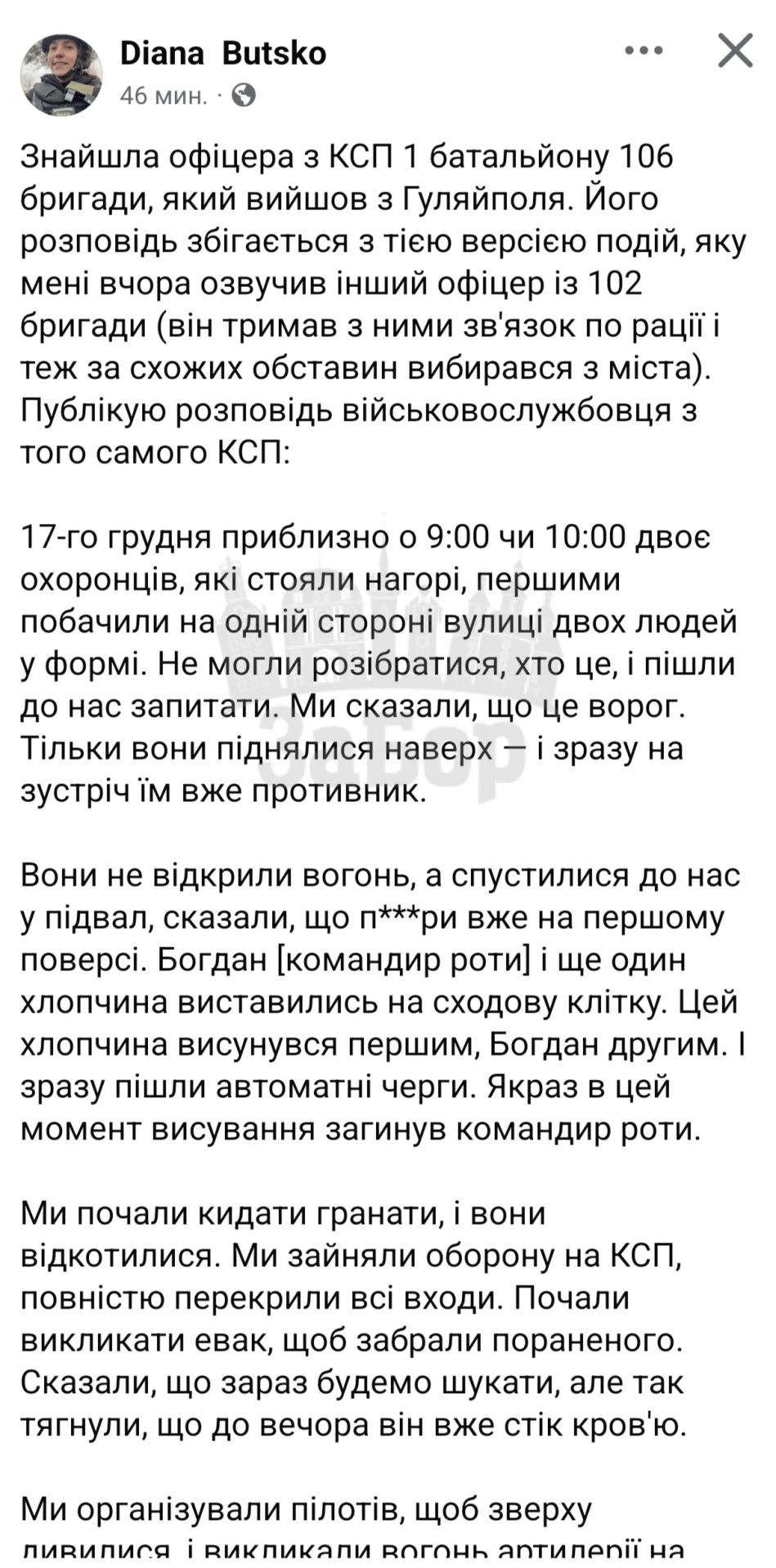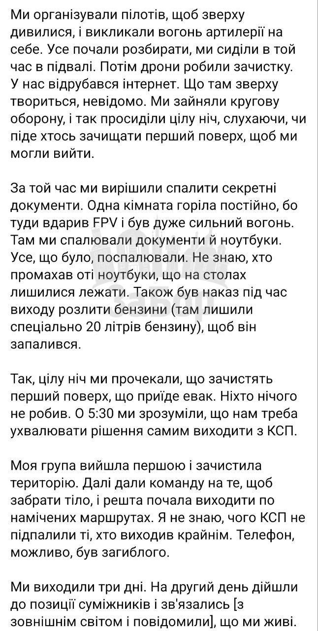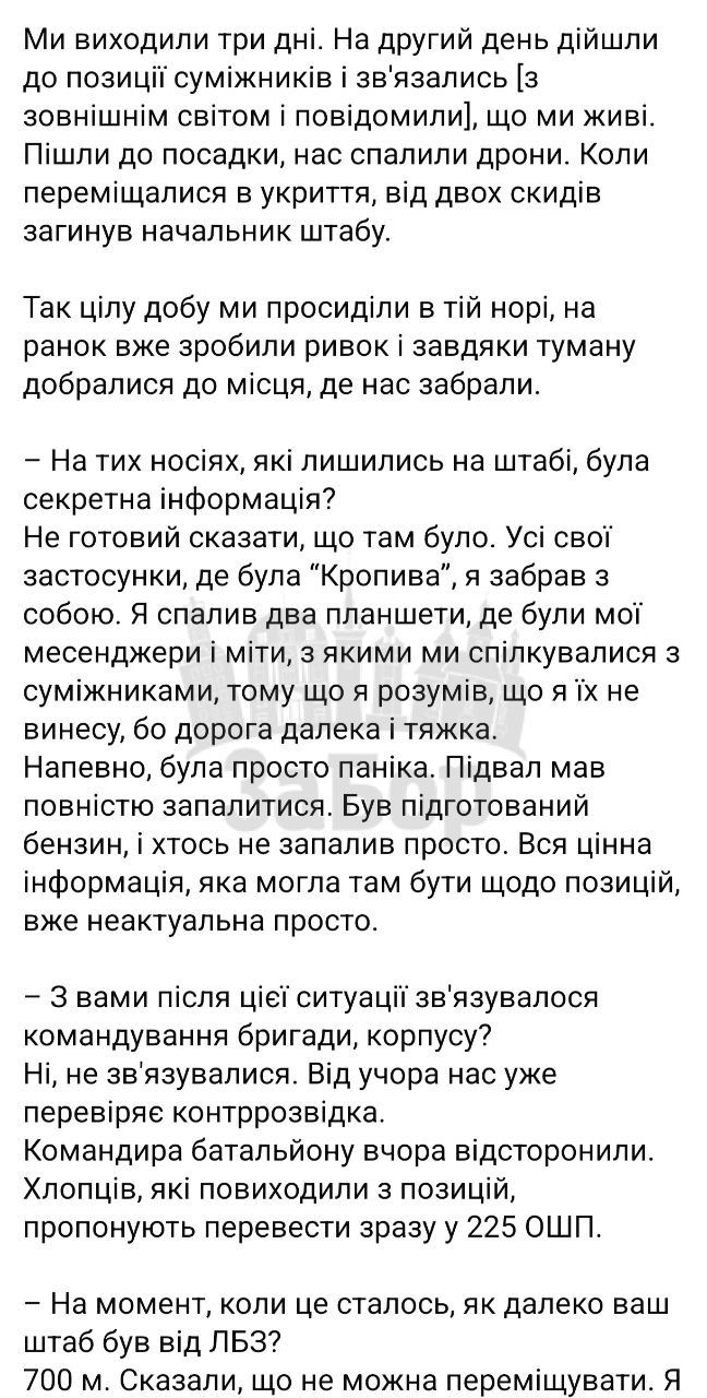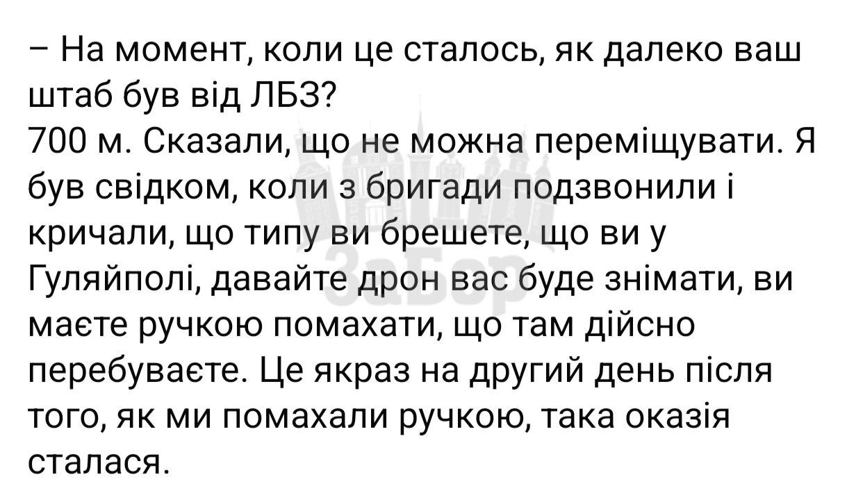 Так журналістка Діана Буцько поспілкувалася з офіцером КСП 1 батальону 106 бригади, що вийшли із Гуляйполя. За його словами, КСП був всього в 700 метрах від ЛБЗ і забороною на переміщення.