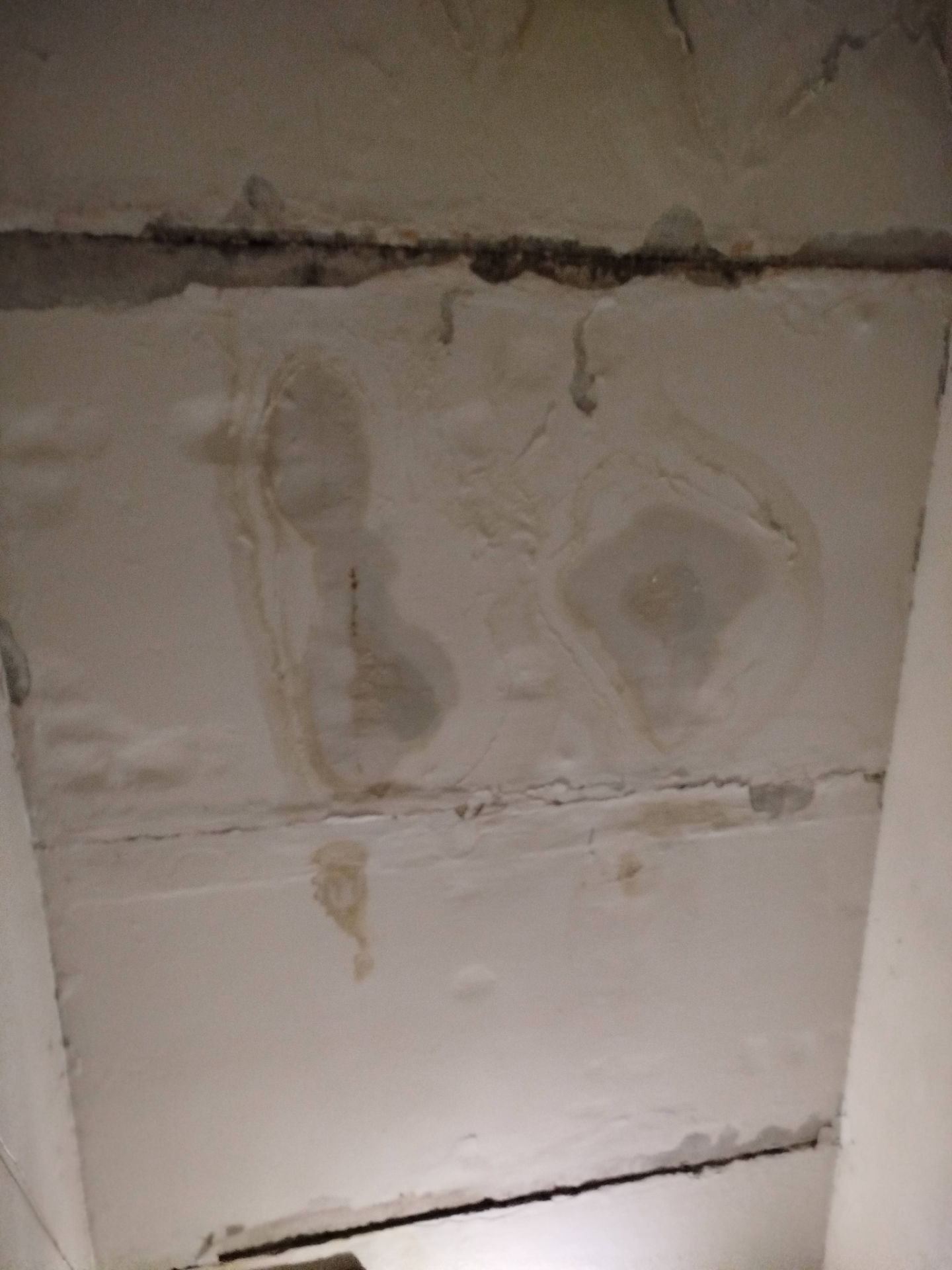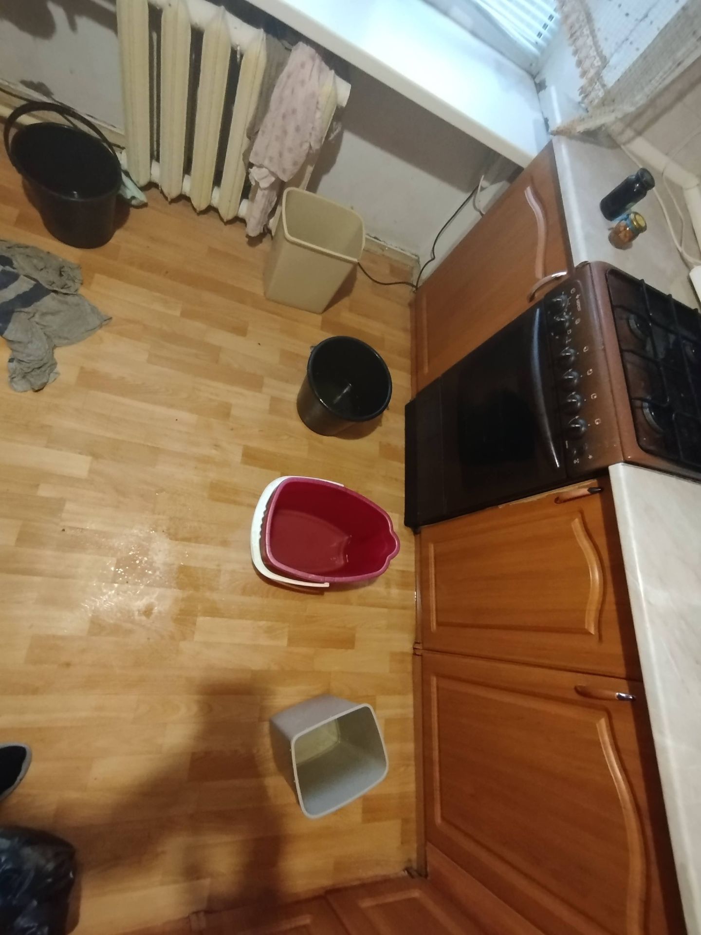За його словами, мешканці змушені кілька разів на день підійматися на технічний поверх, щоб міняти відра, у які стікає вода. На місці влучання вже чітко видно сліди вологи, що поширюються вниз до третього поверху.
