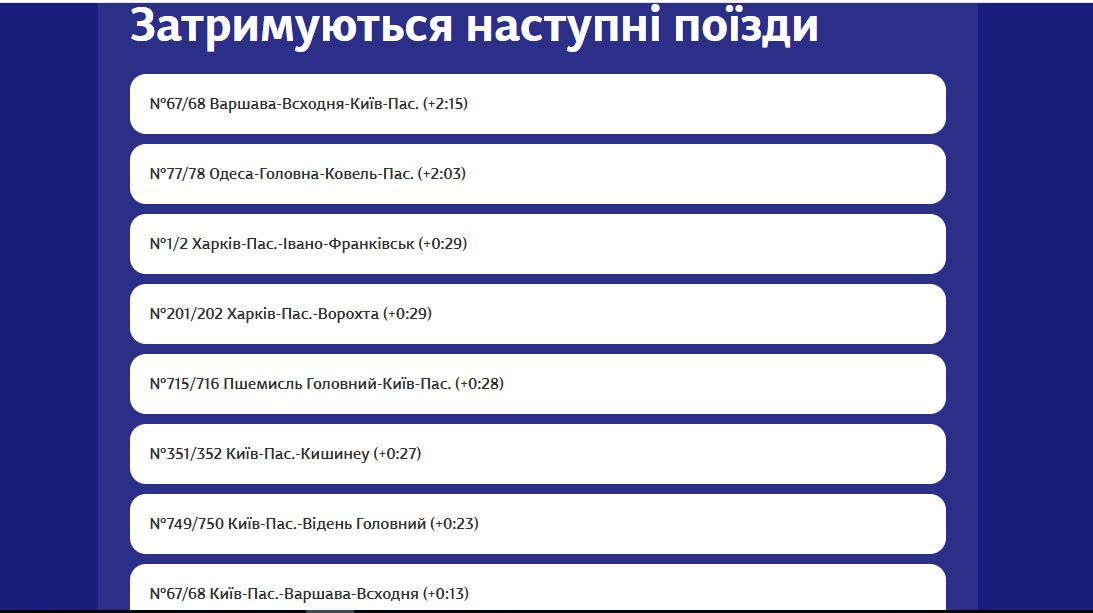 Наразі відомо про відхилення від графіків руху наступних поїздів: