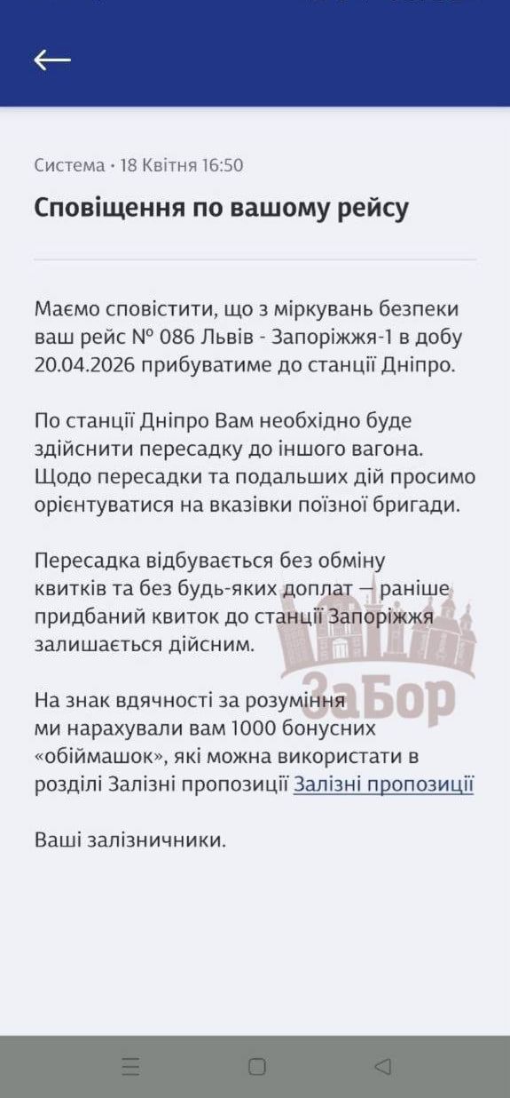 Водночас пасажири іншого рейсу — №086 Львів – Запоріжжя-1, отримали повідомлення про зміну маршруту. Так, з міркувань безпеки, завтра поїзд прибуватиме лише до станції Дніпро. Далі пасажирам необхідно буде здійснити пересадку на інший вагон за вказівками поїзної бригади. До Запоріжжя їхатиме електричка. Найймовірніше, що усіх інших потягів це також стосується.