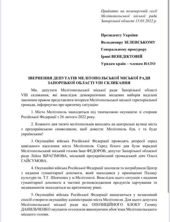 Сегодня же в 9:00 состоялась внеочередная сессия Мелитопольского горсовета. Законная городская власть, избранные депутаты горсовета приняли обращение к Президенту Владимиру Зеленскому, Генпрокурору Украины Ирине Венедиктовой и странам – членам НАТО.