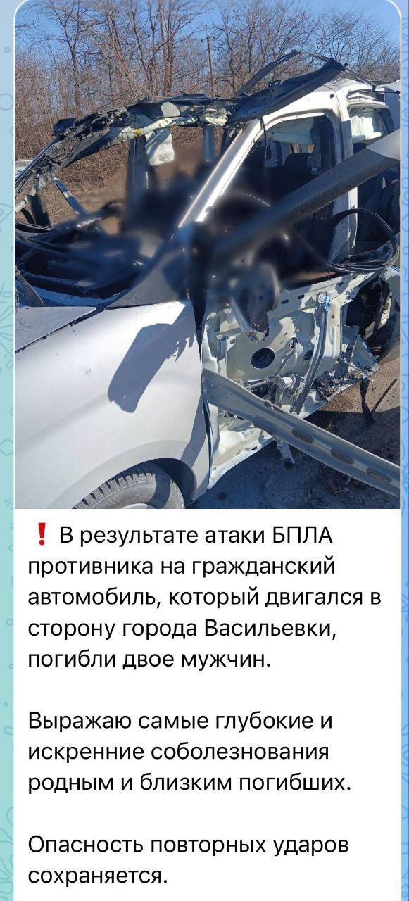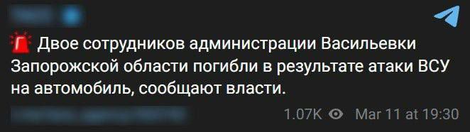 Російські окупаційні ресурси спершу повідомили про загибель двох «мирних мешканців» у тимчасово окупованій Василівці Запорізької області. Однак згодом з’ясувалося, що йдеться про працівників створеної окупантами місцевої «адміністрації». Детальніше – "ЗаБор".