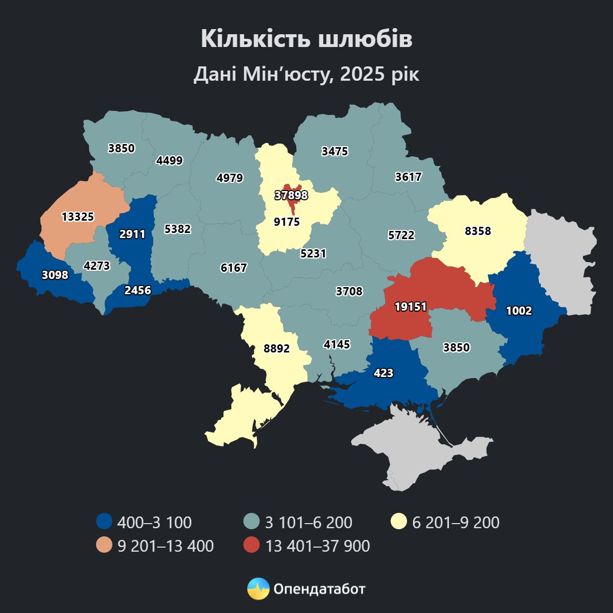 Водночас суттєве скорочення кількості одружень зафіксували у прифронтових і центральних регіонах, зокрема в Донецькій області (–40%), Черкаській області (–15%) та Рівненській області (–14%).