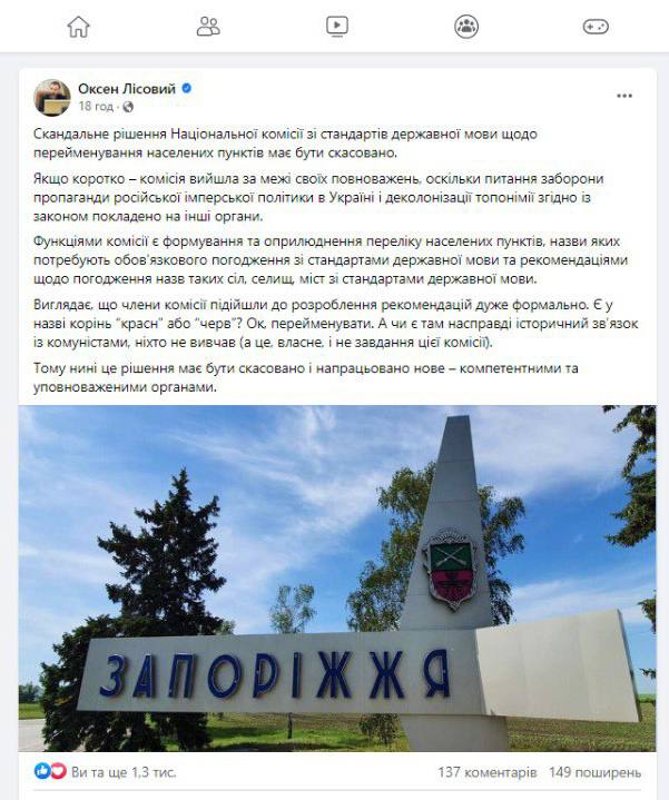 Так, міністр освіти та науки Оксен Лісовий заявив, що рішення Нацкомісії щодо перейменування населених пунктів, в тому числі Запоріжжя, має бути скасоване. Про це він заявив на своїй сторінці у соцмережі.