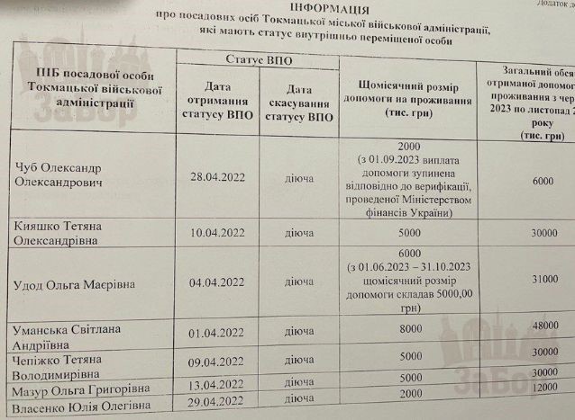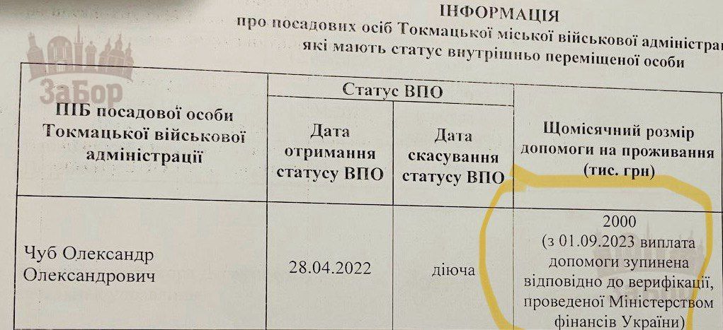 Так, "ЗаБору" стало відомо, що голові Токмацької ВА Олександру Чубу призупинили виплати за оформлення ВПО. Це сталось за результати верифікації, яку провело Міністерство фінансів України. Підтвердження цьому можна побачити в документі, який потрапив в розпорядження "ЗаБору".
