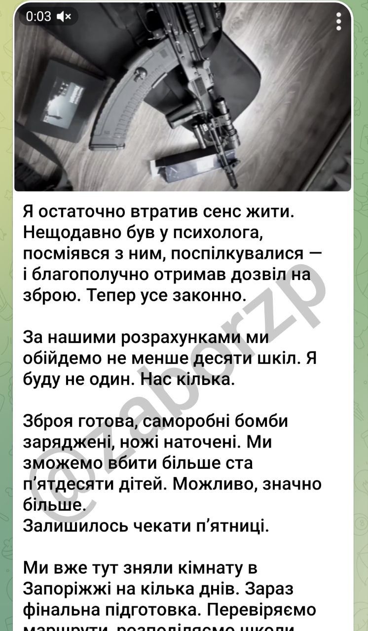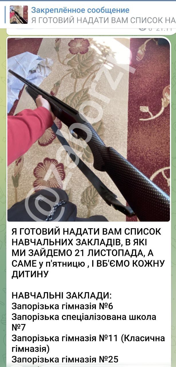 До тексту також додається перелік запорізьких навчальних закладів, в яких начебто відбуватимуться насильницькі дії., а також фото гвинтівки і відео автомату схожого на автомат Калашникова.