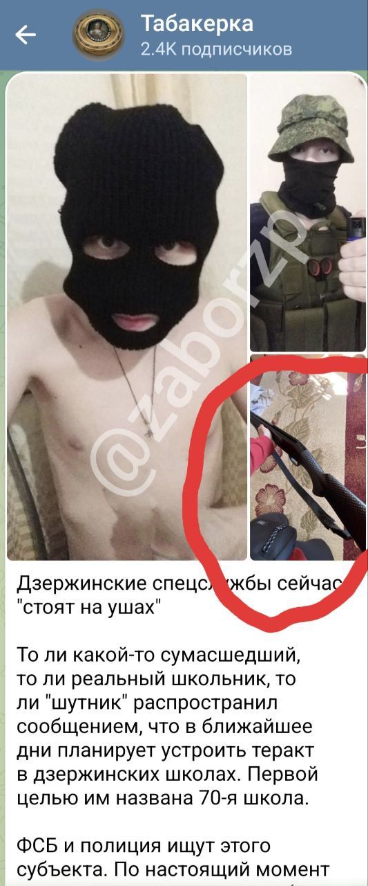 2 лютого 2024 року на російському тг-канлі «Табакерка» було розміщено аналогічний пост з погрозами теракту у школах міста Дзержинська. На тг-каналіз погрозами запорізьким школам була використана одна із цих фотографій.