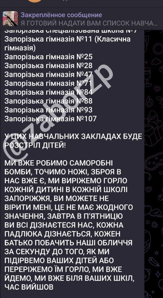 «Ми вже робимо саморобні бомби, точимо ножі, зброя в нас вже є. Ми виріжемо горло кожній дитині в кожній школі Запоріжжя. Ви можете не вірити мені, це не має жодного значення. Завтра в п’ятницю ви всі дізнаєтеся нас…», - йдеться в цих повідомленнях.