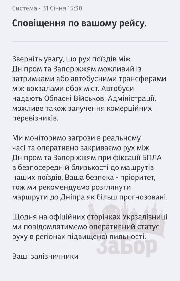 31 січня пасажири, які мають квитки на рейси між Запоріжжям і Дніпром, отримали офіційне повідомлення від Укрзалізниці, у якому йдеться про відсутність прогнозованих термінів відновлення руху.