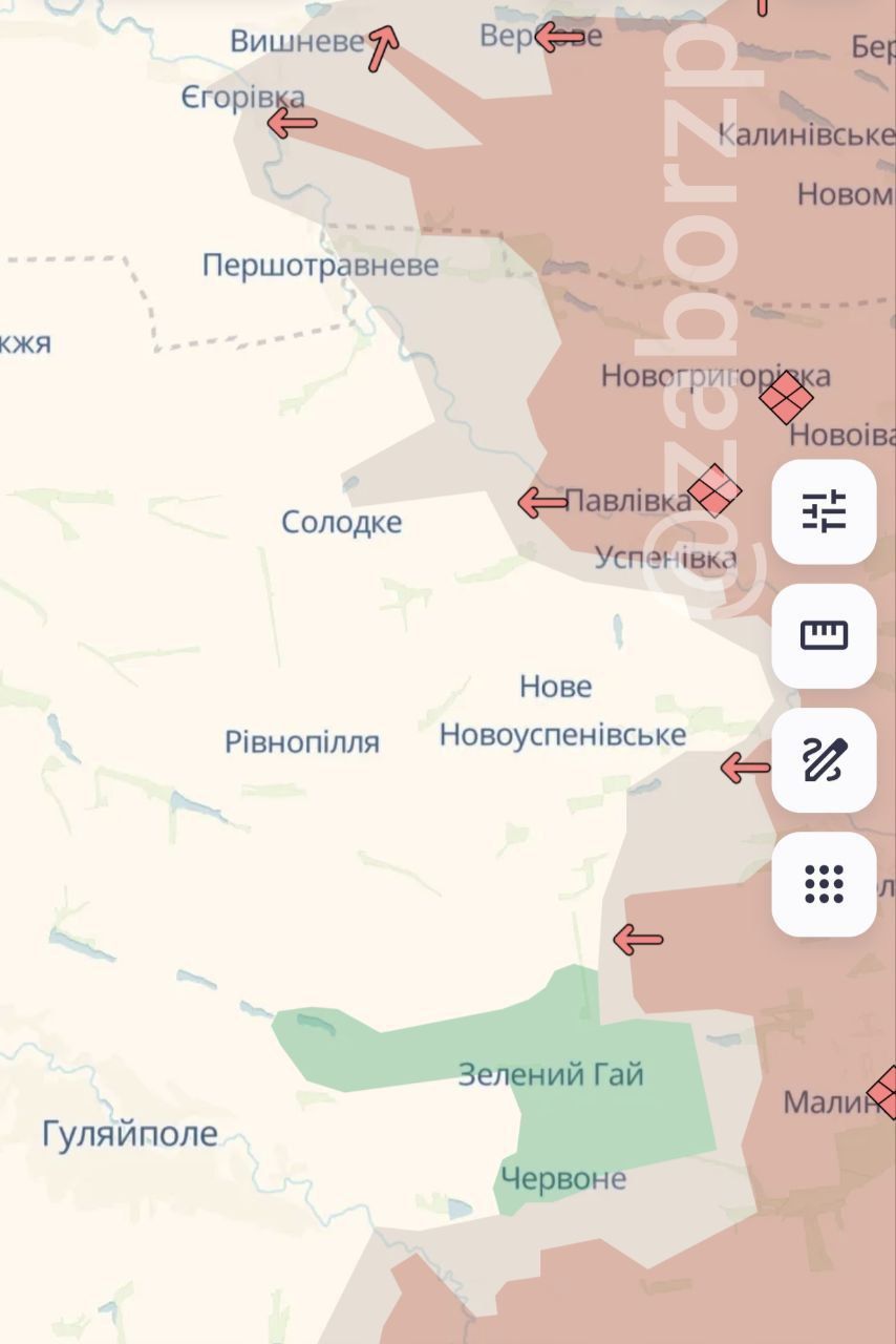 Зокрема, просування російських підрозділів фіксують в Плавнях і Приморському в районі Степногірська а також в районі села Успенівка за Гуляйполем.