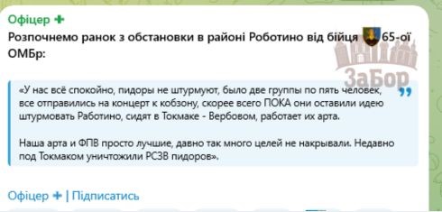 "У нас всё спокойно, рашисты не штурмуют, было две группы по пять человек, все отправились на концерт к кобзону, скорее всего ПОКА они оставили идею штурмовать Работино, сидят в Токмаке - Вербовом, работает их арта. Наша арта и ФПВ просто лучшие, давно так много целей не накрывали. Недавно под Токмаком уничтожили РСЗВ оккупантов".
