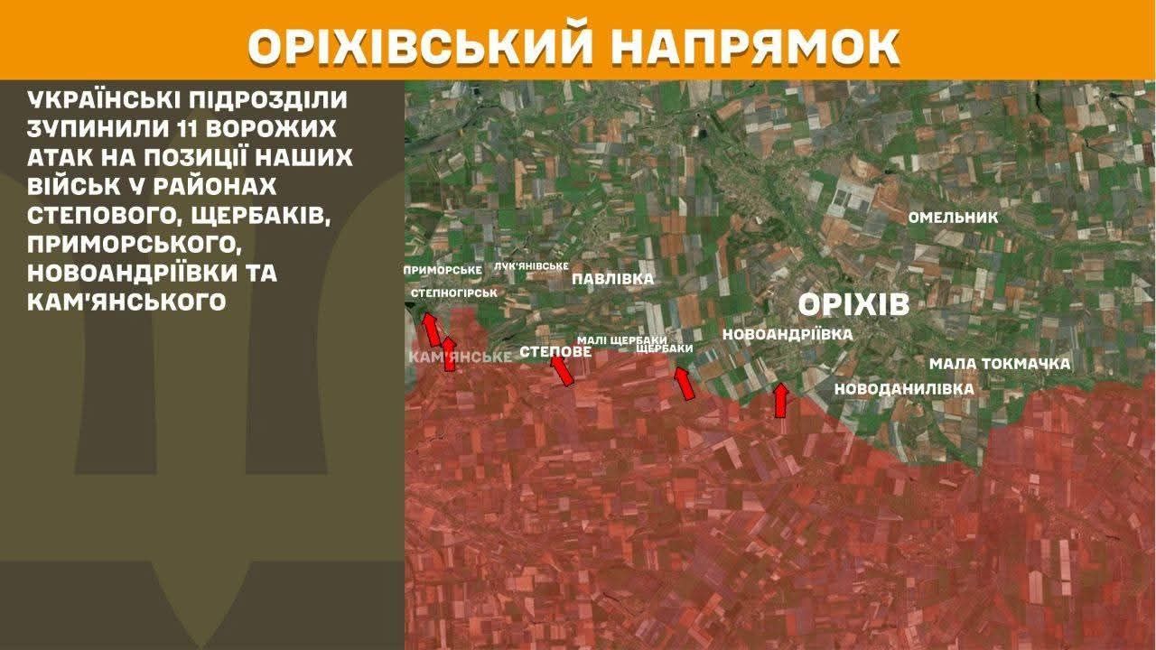 На Гуляйпільському напрямку українські воїни відбили 17 атак росіян у районах Варварівки, Добропілля, Затишшя, Гуляйполя та Зеленого. На Оріхівському напрямку окупанти 11 разів намагалися прорватися біля Степового, Щербаків, Приморського, Новоандріївки та Кам’янського.