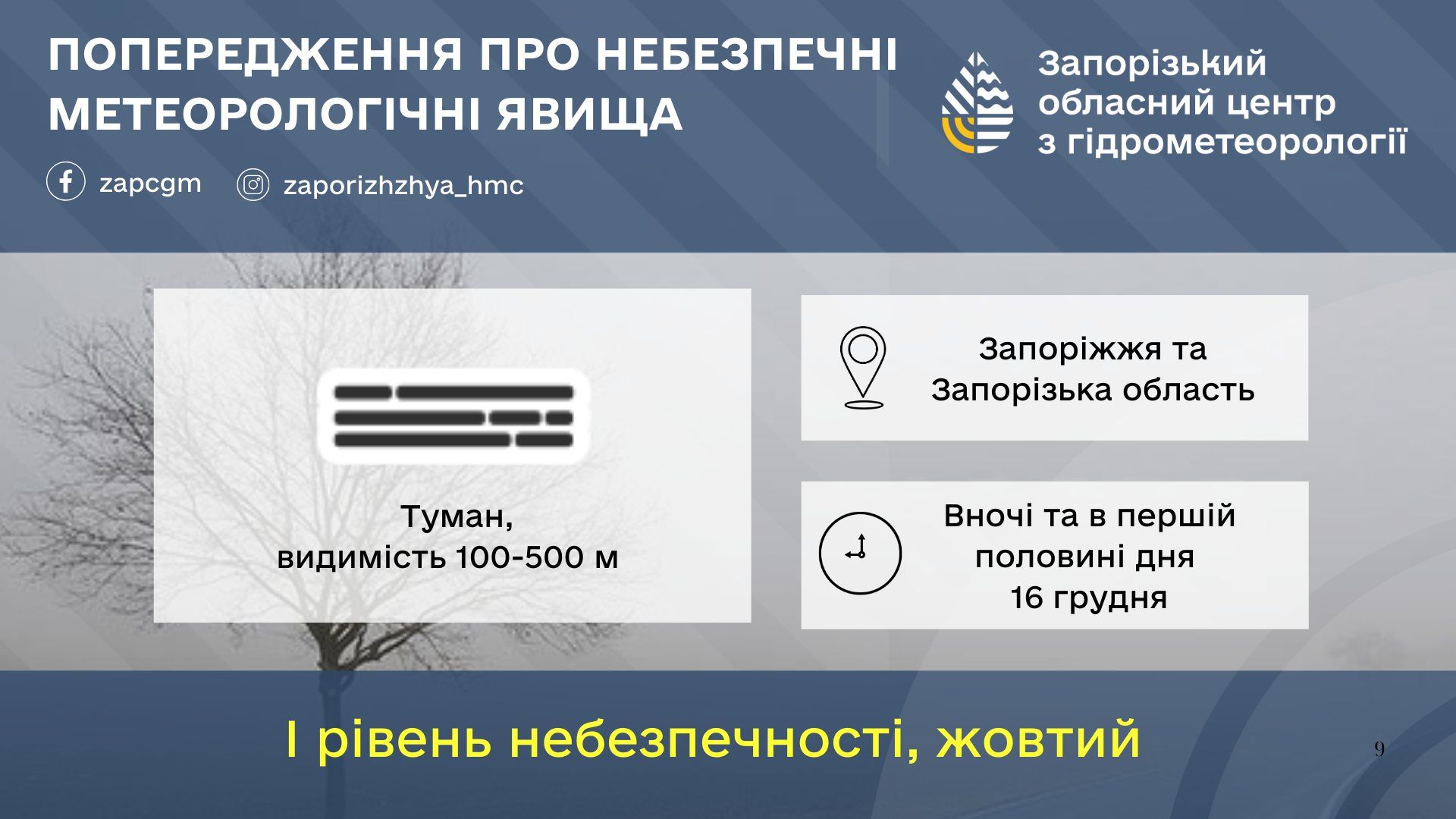 Крім того, вночі та в першій половині дня 16 грудня у Запоріжжі та Запорізькій області прогнозують туман. Видимість складатиме 100-500 метрів. Рівень небезпечності оцінюють як І (жовтий), інформують в Запорізькому обласному центрі з гідрометеорології.