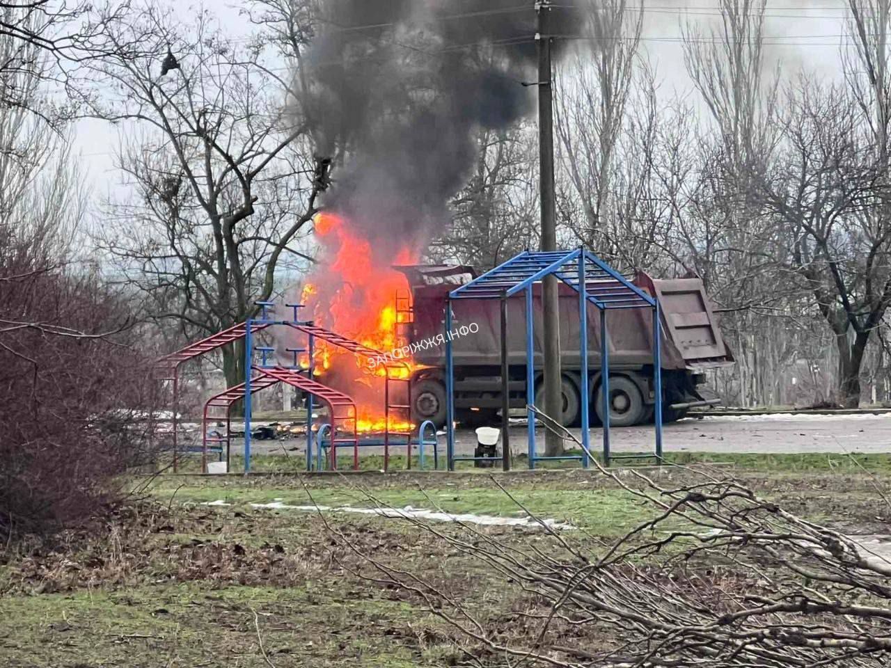 Пізніше в Запорізькій ОВА підтвердили, що внаслідок атаки дрону в одному із районів Запоріжжя вантажний автомобіль загорівся та вигорів ущент.