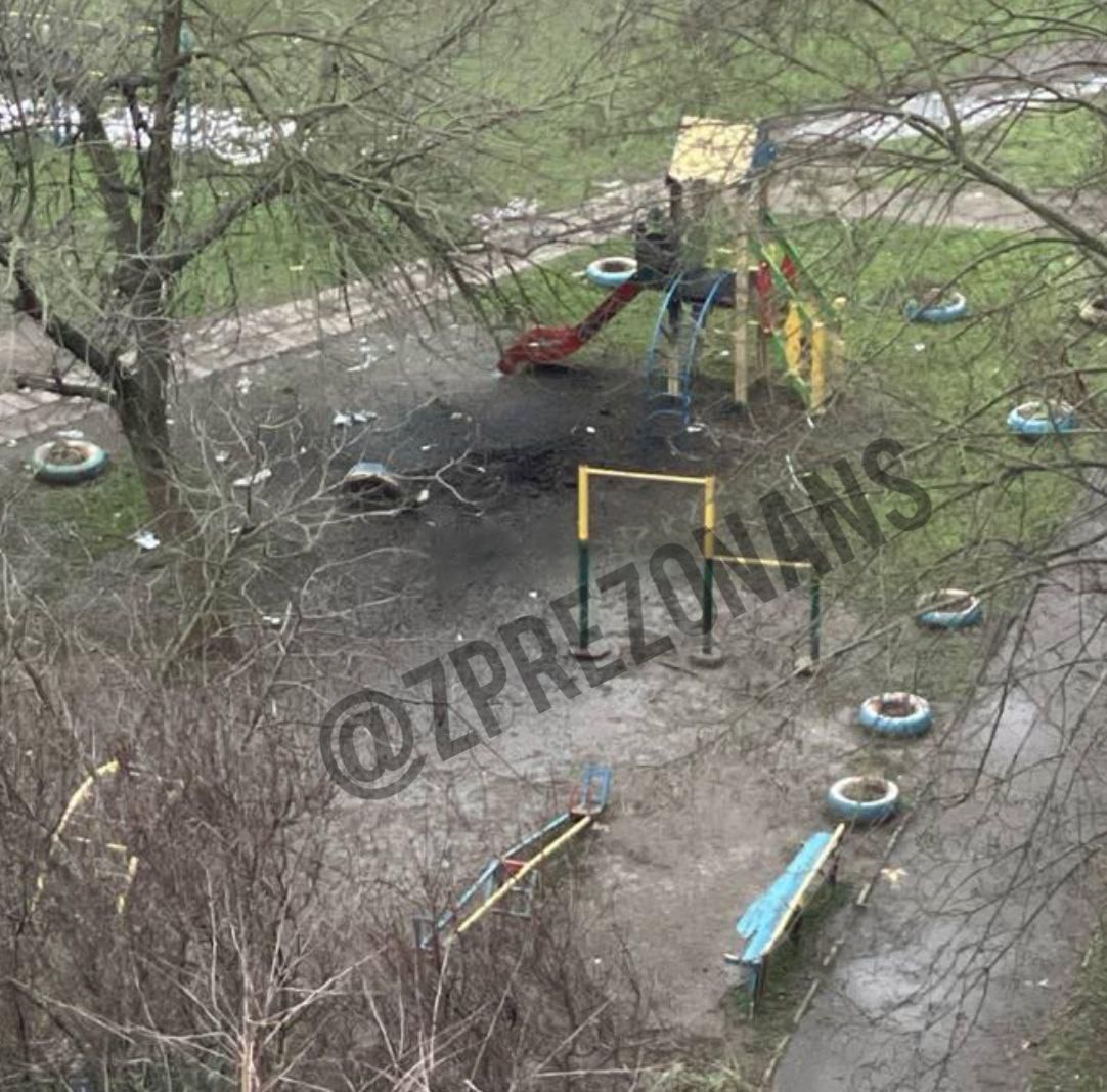 Майже одразу після удару по вантажівці, ще один дрон влучив посеред дитячого майданчику. Фото з'явилися у соцмережі. Поки в ЗОВА офіційно ще не підтверджували другий прильот.