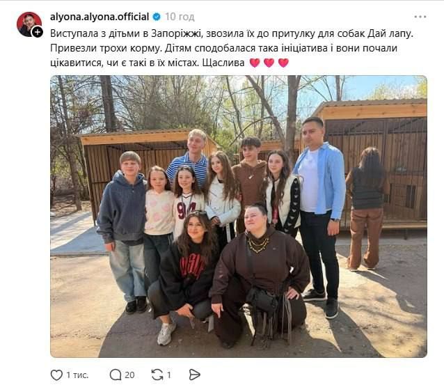 Із нею виступали діти. Потім вона разом із ними відвідала притулок для тварин "Дай лапу, друже". Нагадаємо, що на початку року він зазнав чергового обстрілу, багато тварин загинули.