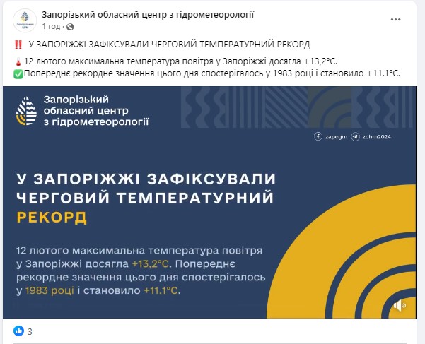 Там повідомили, що 12 лютого максимальна температура повітря у Запоріжжі досягла +13,2°С. Попереднє рекордне значення цього дня спостерігалось у 1983 році і становило +11.1°С. Таким чином вчора була найвища температура у Запоріжжі за останні 41 рік.