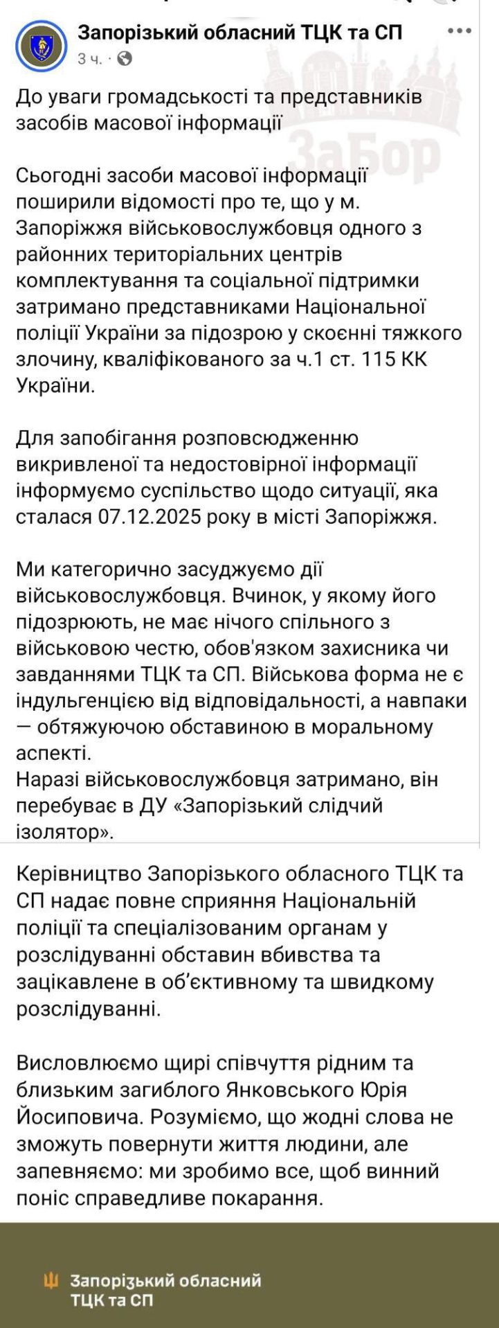 Керівництво Запорізького ТЦК висловило співчуття рідним та близьким загиблого Юрія Янковського та запевнило, що зробить усе можливе, щоб винний поніс справедливе покарання.