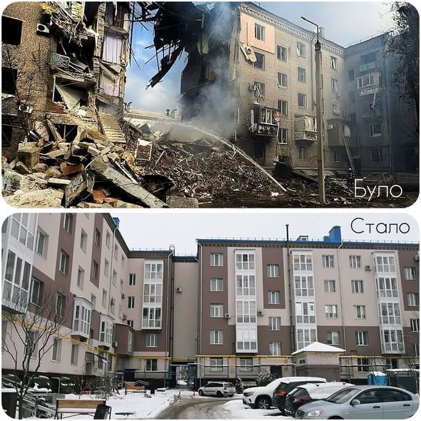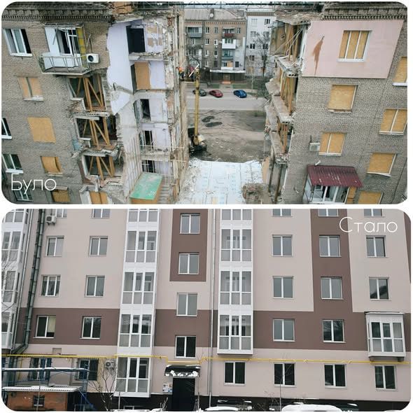Відбудовчі роботи розпочалися у листопаді 2023 року. За цей час будівельники відновили з нуля зруйновану секцію другого та третього під’їздів, облаштували нову утеплену покрівлю, проклали магістральні інженерні мережі водопостачання, каналізації та опалення. Також завершили внутрішні роботи в квартирах і благоустрій прибудинкової території.