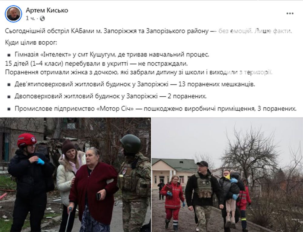 У Запоріжжі та Запорізькому районі ліквідовують наслідки чергових російських ударів. За офіційною інформацією, станом на зараз відомо про 29 постраждалих, серед яких п’ятеро дітей. Пошкоджені житлові будинки, навчальний заклад, інфраструктурний об'єкт. На одному з будинків існує ризик обвалу дев'ятого поверху. Зараз знову спалахнув будинок на Пісках. Детальніше — «ЗаБор».
