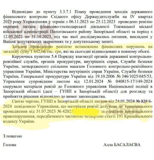 Зараз у розпорядженні "ЗаБору" опинився документ, що порушень які були виявлені при перевірках фінансово-господарської діяльності Токмацької ВА (з 12 травня 2022 р. по 31 жовтня 2023 р.). Це відповідь на запит Верховної Ради від Держаудитслужби, яка й проводила перевірки.