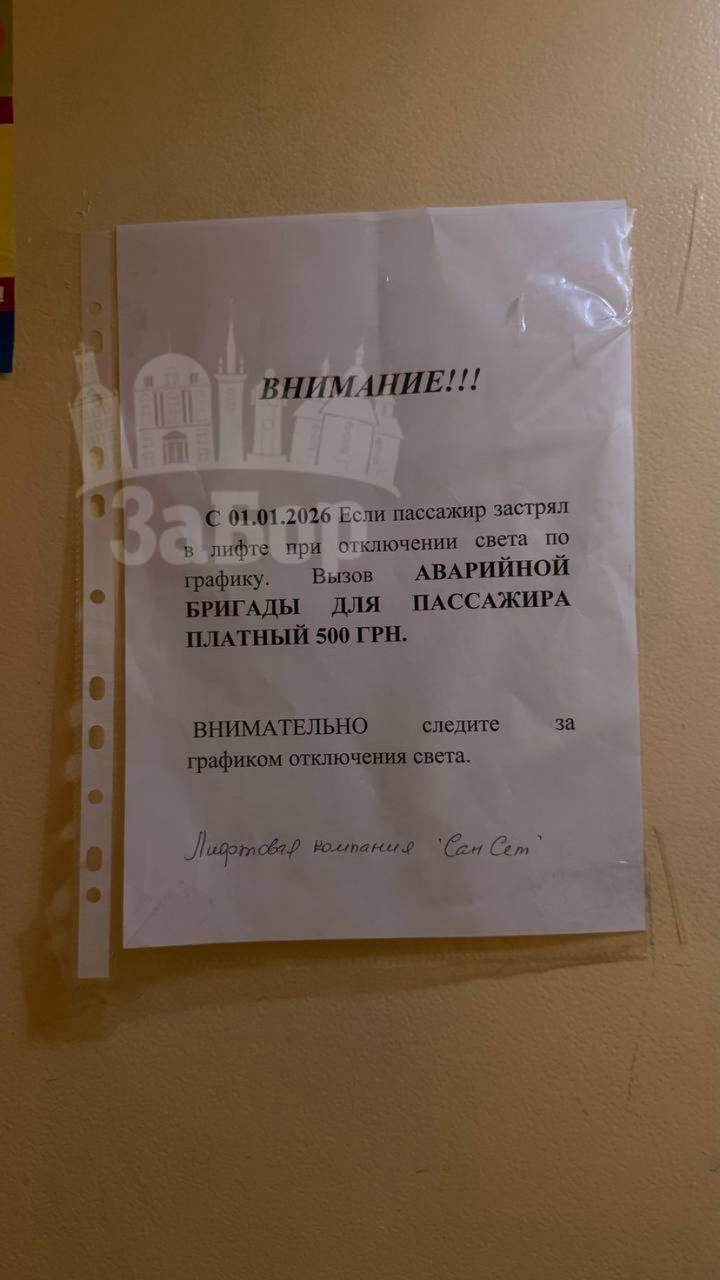 У Запоріжжі у будинку за адресою вул. Запорізька, 4а з'явилося цікаве оголошення. Відтепер, якщо хтось застряг у ліфті під час відключень світла – виклик аварійної бригади обійдеться у 500 грн.