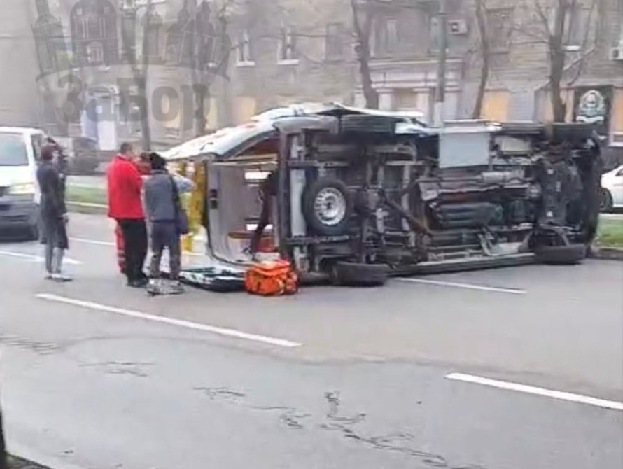 У Запоріжжі сьогодні вранці сталася серйозна ДТП на проспекті Соборному — у районі зупинки «Редакція газети “Запорозька Січ”» карета швидкої допомоги зіткнулася з позашляховиком. Від удару спецтранспорт занесло, після чого він перекинувся на бік.