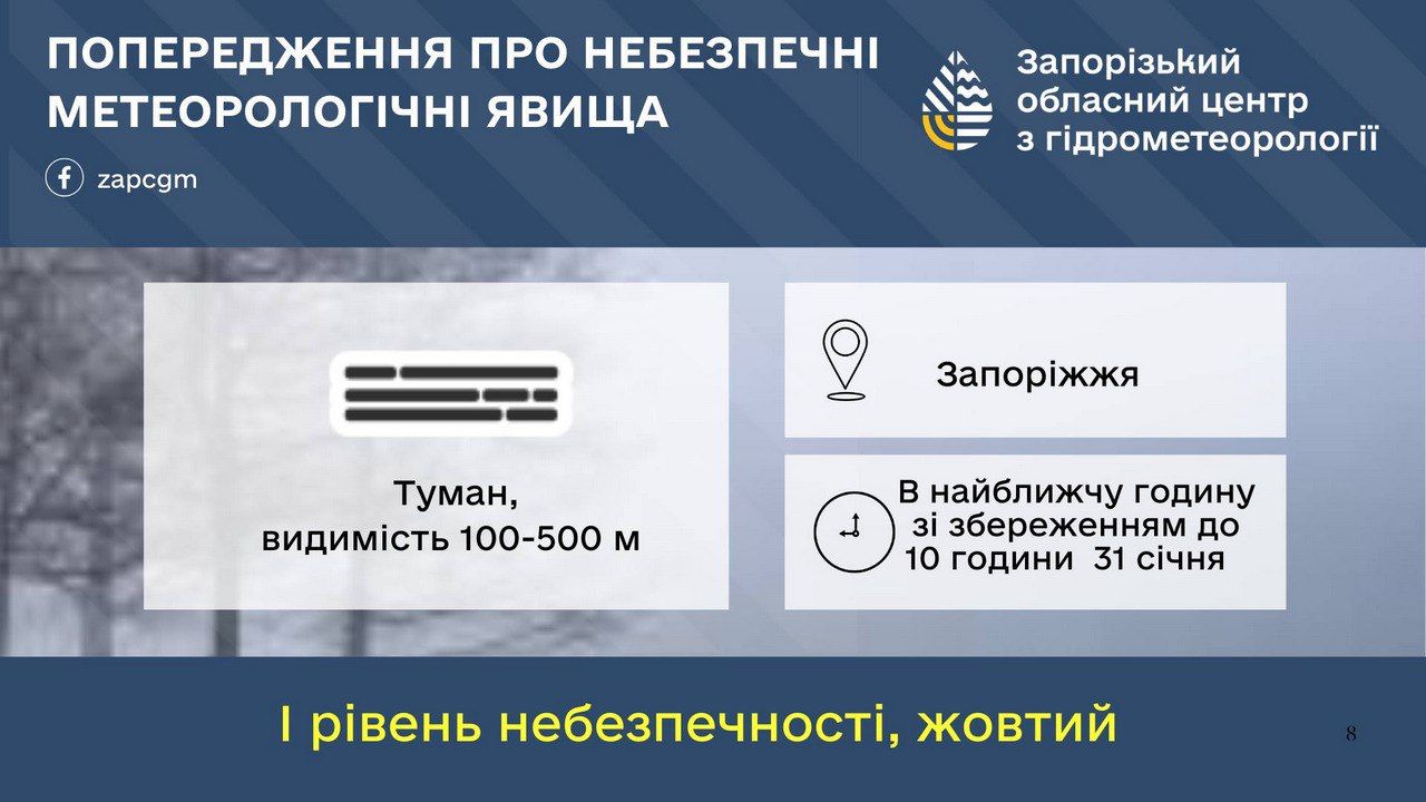 У Запоріжжі в найближчу годину зі збереженням до 10:00 31 січня прогнозують сильний туман. Видимість на дорогах становитиме 100–500 метрів, що відповідає І рівню небезпечності (жовтий).