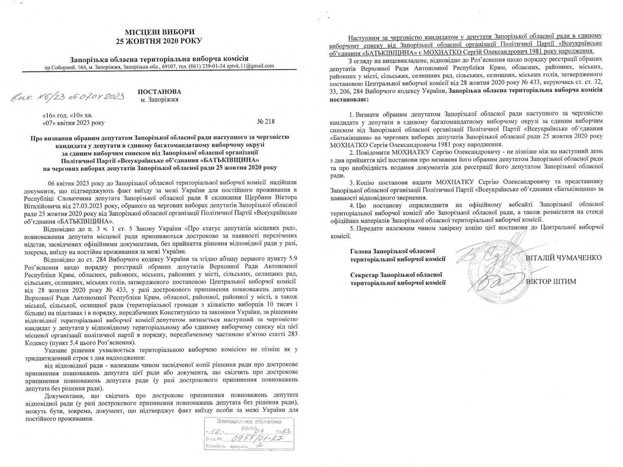 В Территориальную избирательную комиссию еще 6 апреля поступили документы, которые подтверждают его факт выезда из Украины в Словакию. В документе указывается, что именно его переезд стал основанием для досрочного прекращения депутатских полномочий. Теперь на его место зарегистрируют следующего по списку кандидата от партии "Батьківщина". Им станет 42-летний Сергей Мохнатка.