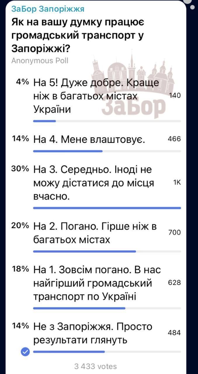 «ЗаБор» у телеграм-каналі провів опитування серед містян щодо якості громадського транспорту в місті. В опитуванні прийняли участь більше 3 тисяч підписників.