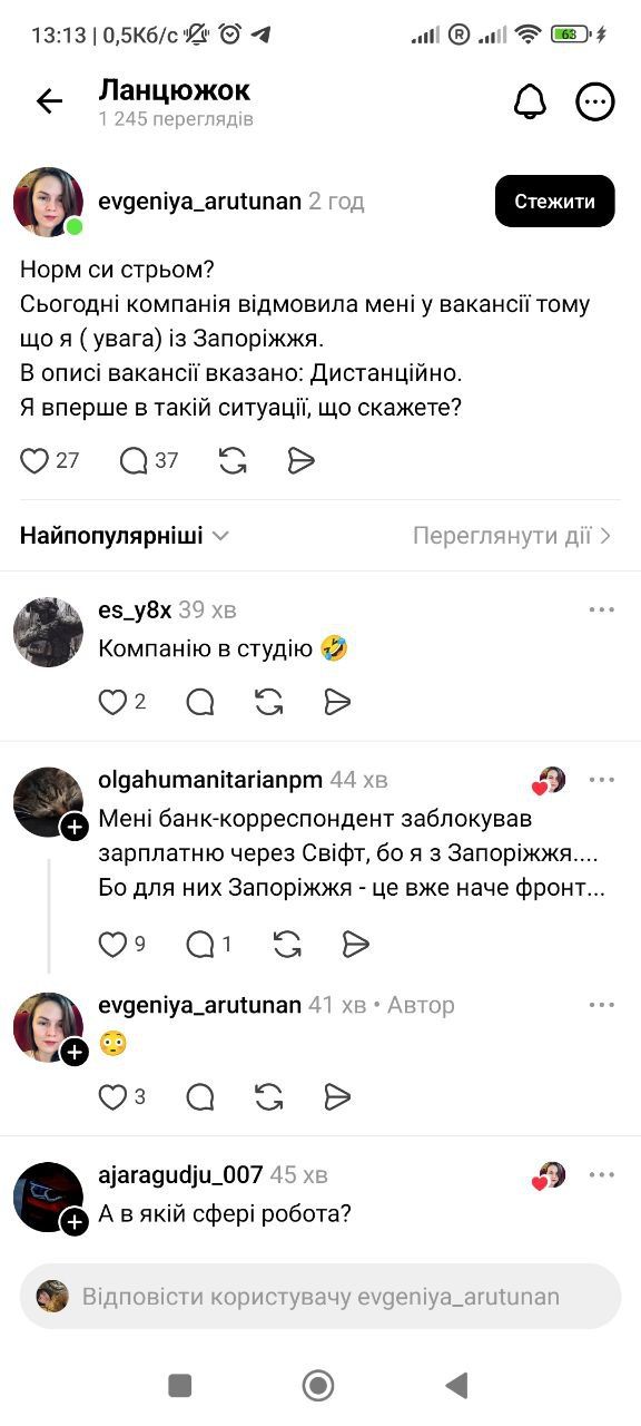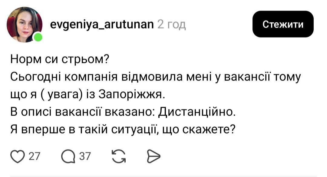«Сьогодні компанія відмовила мені у вакансії тому, що я (увага) із Запоріжжя. В описі вакансії було чітко вказано – дистанційно. Я вперше в такій ситуації».