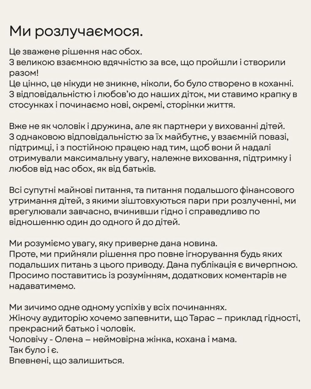 Тарас та Олена Тополі опублікували спільну заяву в Instagram, у якій оголосили про завершення шлюбу. Артисти підкреслили, що розлучення – це їхня взаємна та виважена позиція.