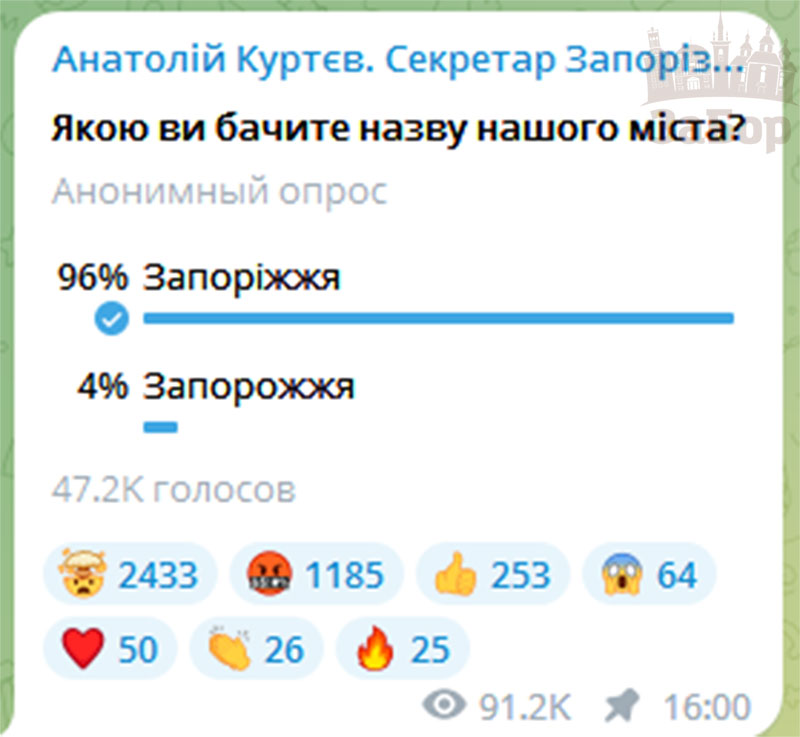 Цікаво, що згідно із опитуванням, 96% запоріжців не бажають перейменувань.