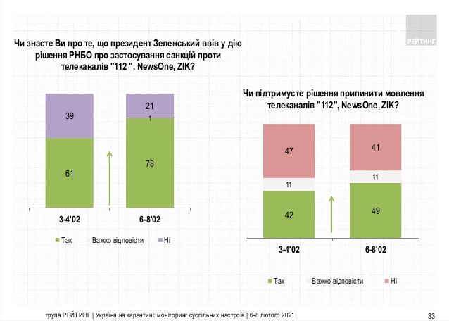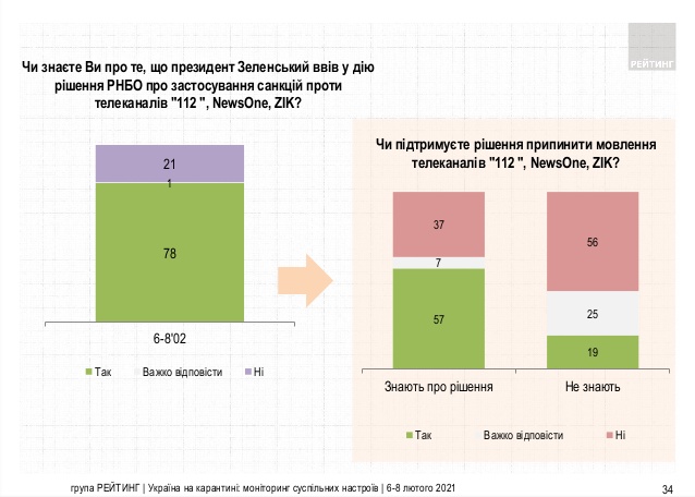 Также, социологи отмечают, что 78% опрошенных жителей знают о том, что Владимир Зеленский ввел в действие решение СНБО, касаемо применения санкций против трех телеканалов ("112 Украина", NewsOne и ZIK), 21% украинцев об этом решении не знали.