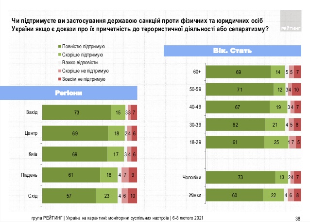 Во всех регионах Украины, большинство опрошенных поддерживают введение санкций против физических и юридических лиц при наличии доказательств, что они причастны к террористической деятельности или сепаратизму.