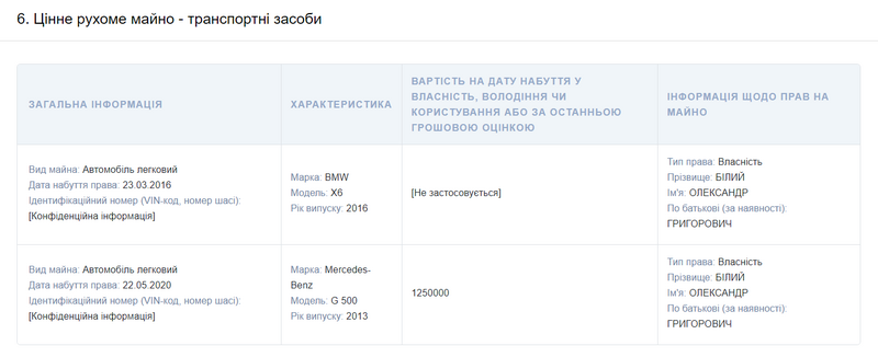 Кроме этого, в декларации указано 2 квартиры, одна площадью 93,8 кв.м за 79 624 тысячи, вторая - 48,8 кв. м за 50 963 тысячи. Также у него есть частный дом площадью 211,4 и земельный участок - 342 кв. м, их стоимость не указана. Помимо этого, у него есть еще 2 автомобиля: BMW X6 - стоимость, которого не указана, приобрел он его в марте 2016, и Mercedes-Benz G 500, его он приобрел за 1 250 000 гривен, появился он у депутата в мае 2020 года.
