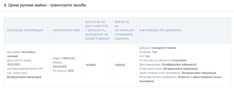 При этом декларации за 2019 год указано, что он официально работает на Васильевском мясокомбинате и получает зарплату в размере 51 104 гривен, также доход он получает и от предпринимательской деятельности в размере 383 934 гривен. Если суммировать два дохода, то они никак не покрывают стоимость недавно приобретенного CADILLAC ESCALADE .