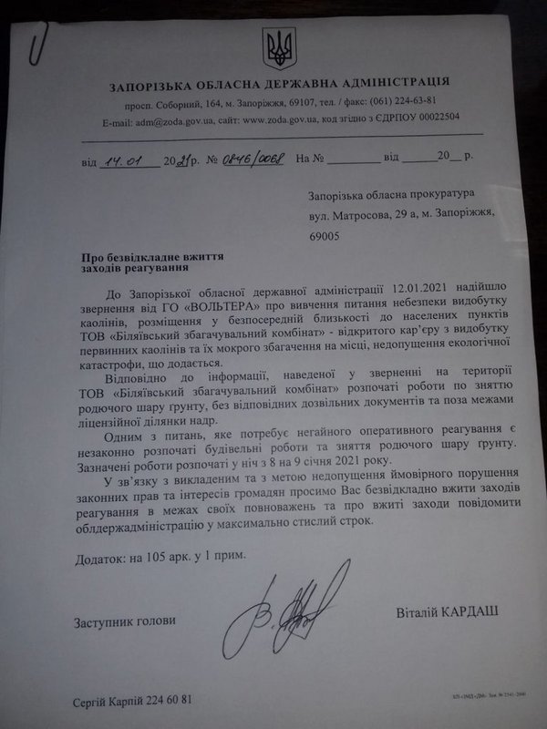 • Руководство Запорожской области требует прекратить работу на каолиновом карьере