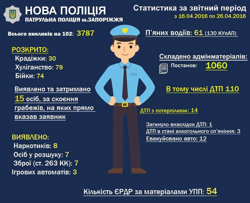 И не смотря на все трагические и криминальные инциденты, патрульные полицейские Запорожья за 10 дней раскрыли 30 краж и задержали 61 пьяного водителя. Подробную инфографику с достижениями новых копов опубликовали на страничке в соц сети сотрудники пресс-службы полиции.