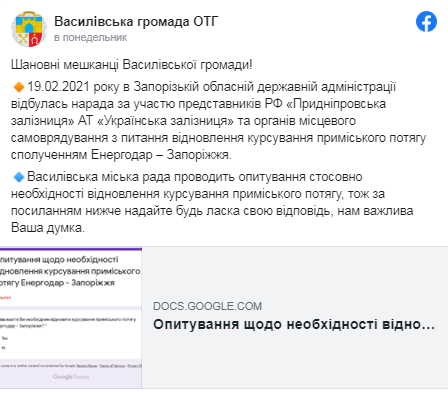 • В Запорожской области могут восстановить движение поезда "Запорожье-Энергодар": среди жителей проводят онлайн-опрос.