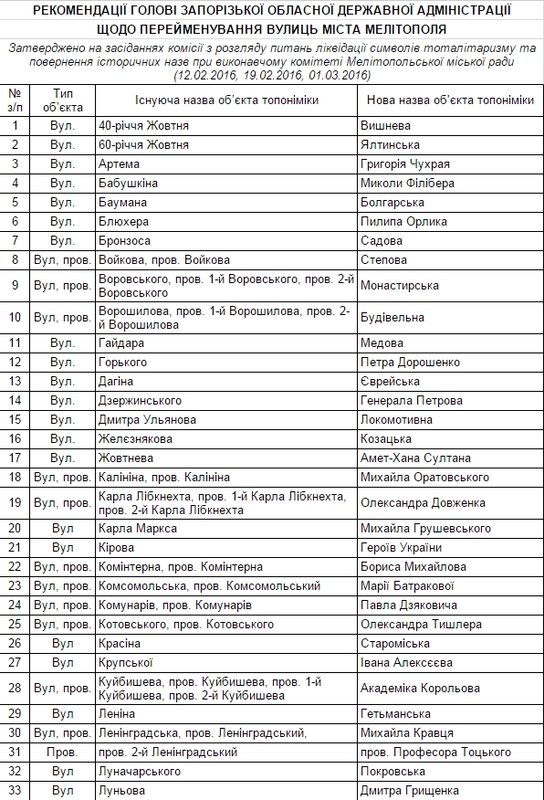 Переименование улиц в Мелитополе. Так, город Мелитополь, все же, начал декоммунизацию. 1 марта состоялось заседание специальной комиссии при исполкоме горсовета. За время заседания, успели переименовать 59 улиц. При этом любопытно, что мелитопольцы увековечили имя легендарного генерала Петрова, в честь которого была названа в советские годы и 55-ая артиллерийская бригада на "Уральских казармах" в Запорожье. Петров был уникальной личностью в истории, он воевал без обеих рук и сам он из Запорожского края. При этом в Запорожье улицы с именем Петрова так и не появилось.