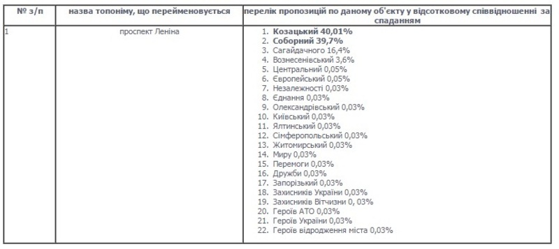 В Запорожье решение о переименовании проспекта Ленина на Казацкий вынесут на сессию горсовета, произойдет это по результатам онлайн-голосования на сайте мэрии. В голосовании лидировало название "Соборный", но в последний момент странно вырвался вперед вариант "Козацкий".