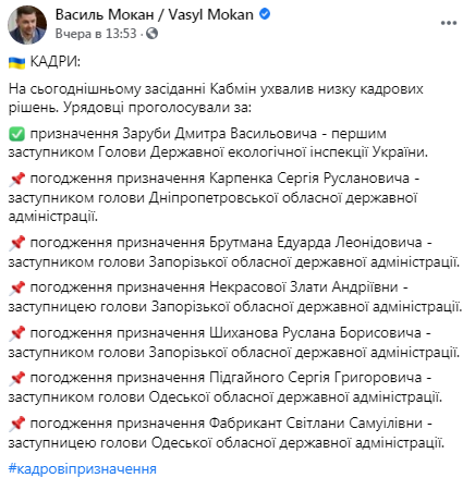 17 февраля Кабмин утвердил ряд кадровых решений. Об этом сообщил на своей странице Фейсбук Василий Мокан - народный депутат Украины, постоянный представитель Кабинета Министров Украины в Верховной Раде.
