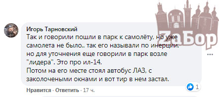 Не забыли, и упомянуть самолет "Ил-14", который стоял на Бочарова в Шевченковском районе. Игорь Тарновский рассказывает, что после того, как его убрали, вместо самолета поставили автобус ЛАЗ с заколоченными окнами, тогда в нем организовали тир. Так, Игорь Тарновский говорит: "Так и говорили пошли в парк к самолёту, но уже самолета не было.. так его называли по инерции. Но для уточнения еще говорили в парк возле "лидера". Это про ил-14. Потом на его месте стоял автобус ЛАЗ, с заколочеными окнами и вот тир в нем застал".