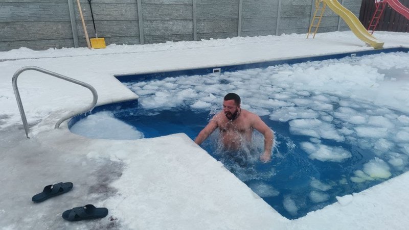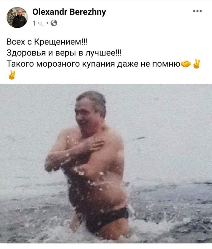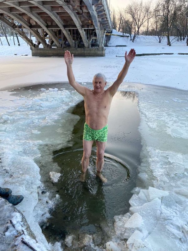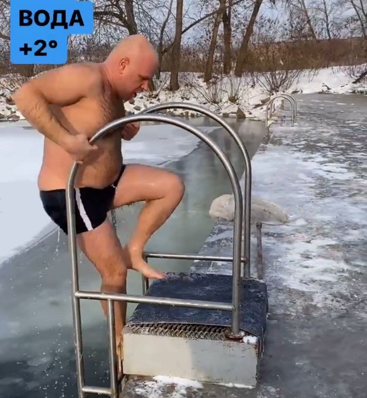 - Народный депутат от ОПЗЖ Владимир Кальцев старается не пропускать крещенских купаний. Прыгнул в прорубь он и в этот раз. В комментарии он говорит, что за городом, где он и нырял температура - 19 градусов.