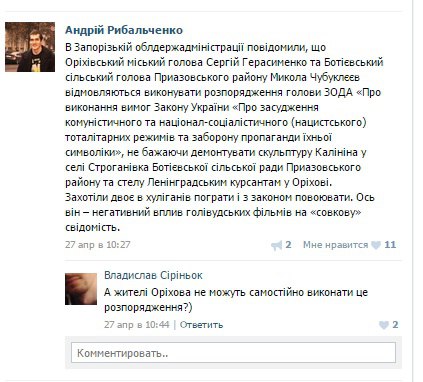 27 апреля помощник народного депутата Украины Игоря Артюшенка Андрей Рибальченко написал на своей странице Вконтакте о том, что мэр Орехова Сергей Герасименко отказывается демонтировать стелу Ленинградским курсантам в своей городе, тем самым нарушает закон.