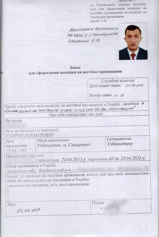 Так, в сеть Интернет попало заявление террориста на прописку в селе Новопетровка, Бердянского района.