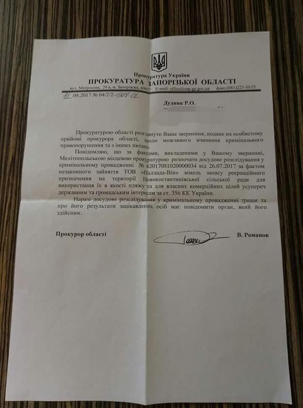 Мелитопольский активист Роман Дудник неоднократно обращался в контролирующие инстанции с требованием прекратить незаконный сбор денег. Но везде получал отказ. Мол 3,5 га пляжной зоны с 2007 года находится в аренде у фирмы ООО "Падала Він". Всего владелец фирмы - некий Отрошко арендует 7,0008 га земли, находящейся в собственности Новоконстантиновского сельсовета Приазовского района, пишет "РИА-Мелитополь". Не удавалось убрать шлагбаум и другим активистам.