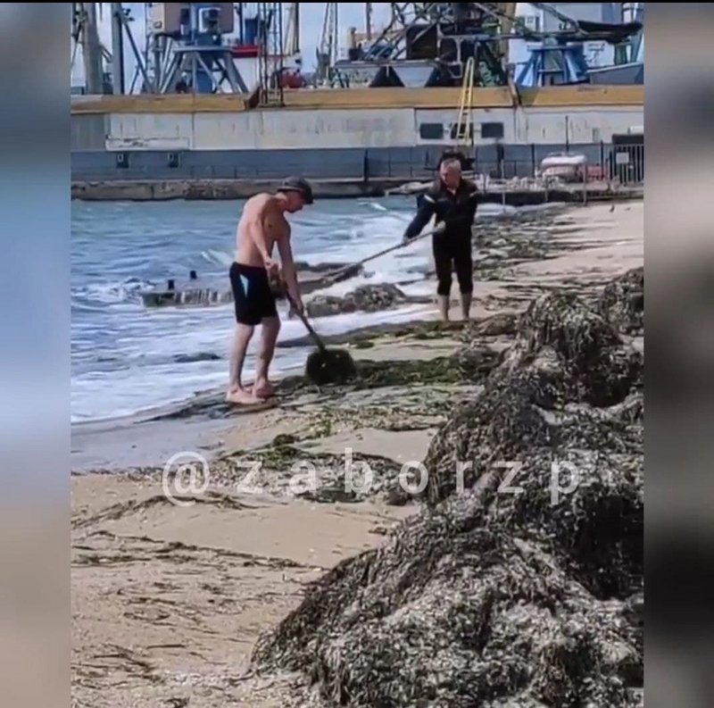 В городе Бердянск Запорожской области местные жители сняли на видео, как двое мужчин забрасывают водоросли с берега обратно в море, передает "ZаБор".