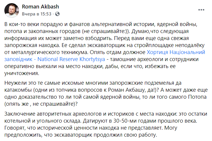 А вот запорожский экскурсовод Роман Акбаш считает, что это могут быть те самые запорожские катакомбы.
